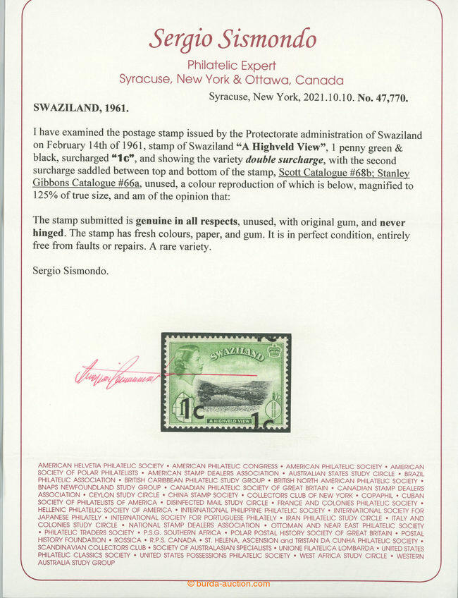 | Zusatzinformationen und Suchstichworte: | Burda 69. Auktion 10. - 11. September 2022 Los 897 Swaziland 1961 SG. 66a, Elisabeth II. Landschaft 1C/1P, Doppelaufdruck; Luxusbriefstück mit Attest Sismondo, c. v. £2,250 Zuschlag 1.760,00 EUR |