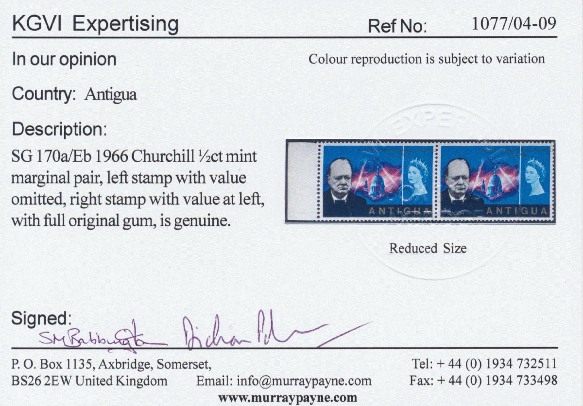 | Zusatzinformationen und Suchstichworte: | Doreen Royan & Associates Shop - Online Los 750810 Antigua und Antigua Barbuda Antigua. 1966 Churchill Commemoration. ½c. multicoloured. Marginal horizontal pair. Variety, ‘left stamp has value omitted, right stamp with value at left instead of right’. Superb unmounted mint condition. KGVI Expertising Certificate No. 1077/04-09 (2009). Quantity: circa 10 mint. OUTSTANDING AND VERY RARE. Festpreis 980,00 GBP |