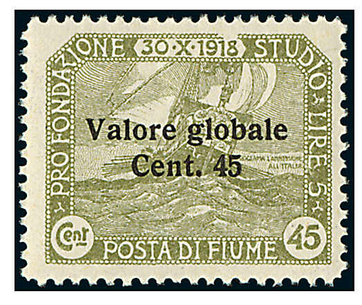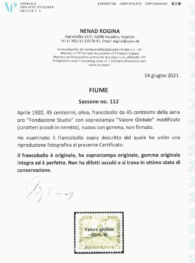 | Zusatzinformationen und Suchstichworte: | 113. Kirstein-Larisch Auktion 1. - 3. Dezember 2022 Los 1476 Fiume 1919, Freim., 45 C. auf 45 C. oliv, fetter Aufdruck, postfrisches Prachtstück, aktuelles Fotoattest Rogina, Sass. 112 (350.-€) Ausruf 25,00 EUR |