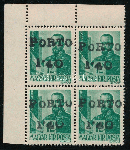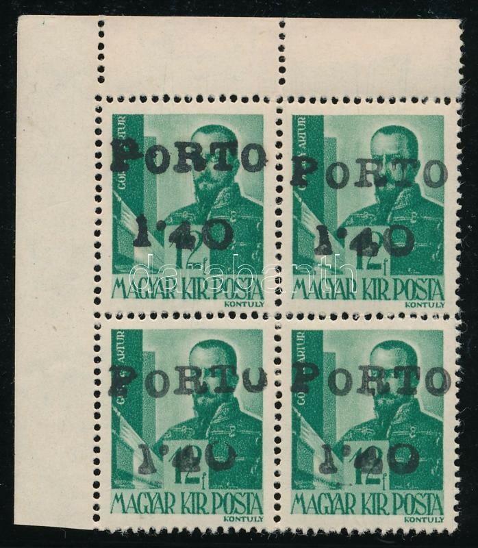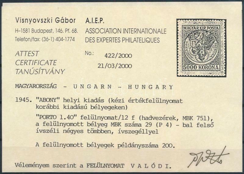 | Zusatzinformationen und Suchstichworte: | 39. Darabanth Auktion 5. November 2022 Los 524 Ungarn Abony 1945 1,40P/12f ívsarki négyestömb, az ívszélin falc / corner block of 4, hinged in the margin. Certificate: Visnyovszki Ausruf 36.000,00 HUF |