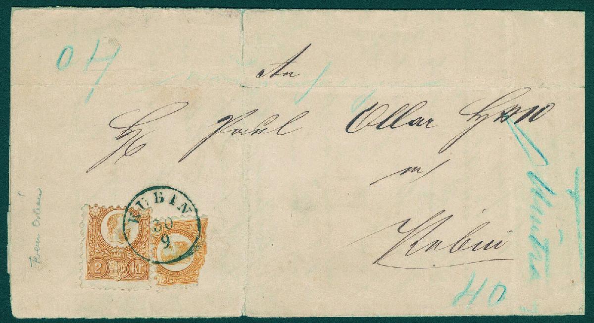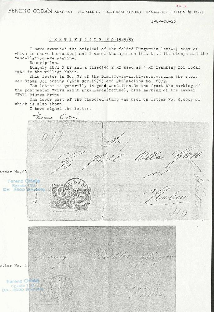| Zusatzinformationen und Suchstichworte: | Gert Müller 116. Auktion 24. - 26. November 2022 Los 2246 Ungarn DAS KUBIN-PROVISORIUM: 2 Kr. orange mit einer Halbierung der 2 Kr. orangegelb auf portogerechtem gef. Ortsbrief mit Inhalt und datiert mit klarem K1 "KUBIN 30.9." (geschrieben in Kubin am 28. September 1873), von einem Rechtsanwalt, vom Empfänger nicht angenommen mit Vermerk des Postmeisters. Auch der Brief mit der unteren Hälfte der Halbierung ist bekannt und im Dimitrovic-Archiv unter der Nr. 4 verzeichnet. Der hier angebotene Brief ist dort unter der Nr. 28 gelistet. Außerdem ist er in der ungarischen Zeitschrift Philatelica abgebildet (2. Ausgabe von 1989). Eine der großen Raritäten der klassischen Ungarn-Philatelie! Fotoattest Ferenc Orban Ausruf 4.000,00 EUR |