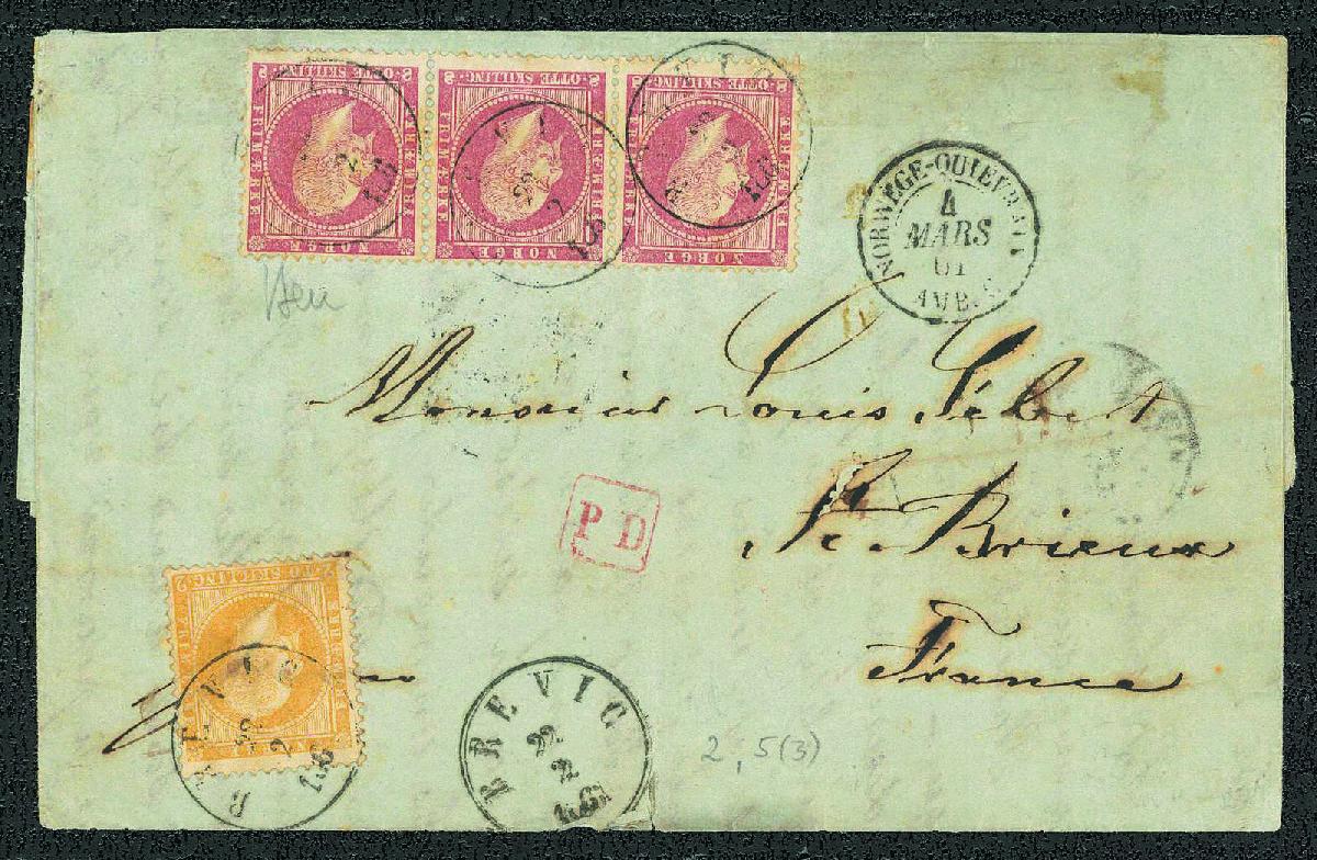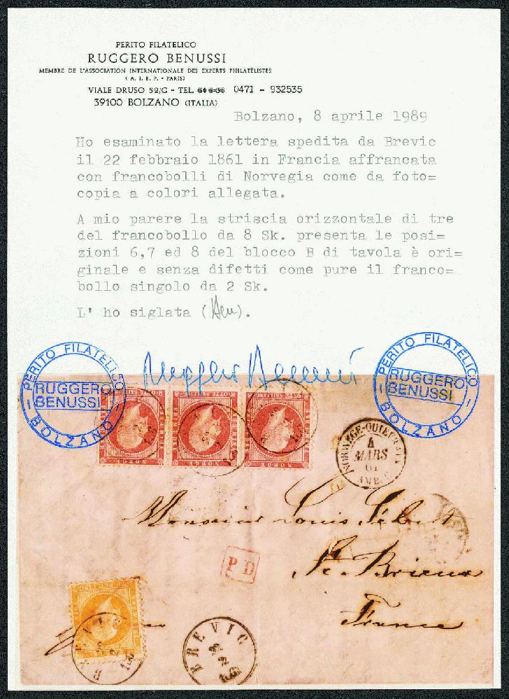 | Zusatzinformationen und Suchstichworte: | Gert Müller 116. Auktion 24. - 26. November 2022 Los 2151 Norwegen 2 Sk. gelb und 8 Sk. karmin im Dreierstreifen, König Oskar I, kleine Beanstandungen, etwas unfrisch, auf Brief von "BREVIG 22.2.1861" nach Frankreich mit verschiedenen Transit- und Ankunftsstempeln. Eine attraktive und seltene Auslandsfrankatur! Fotoattest Benussi. Ausruf 1.000,00 EUR |