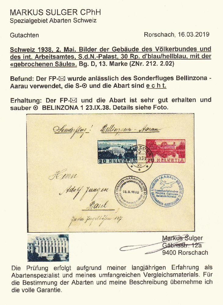 | Zusatzinformationen und Suchstichworte: | Leandra Honegger Briefmarken 4. November 2022 Los 980 Schweiz Abarten (Frei- und Werbemarken) ABARTEN - FREI- & WERBEMARKEN 1938, 30Rp. SDN-Palast, mit gebrochener Säule, auf Flugbrief Bellinzona - Aarau SF38.3b. Gutachten Sulger Ausruf 400,00 CHF |