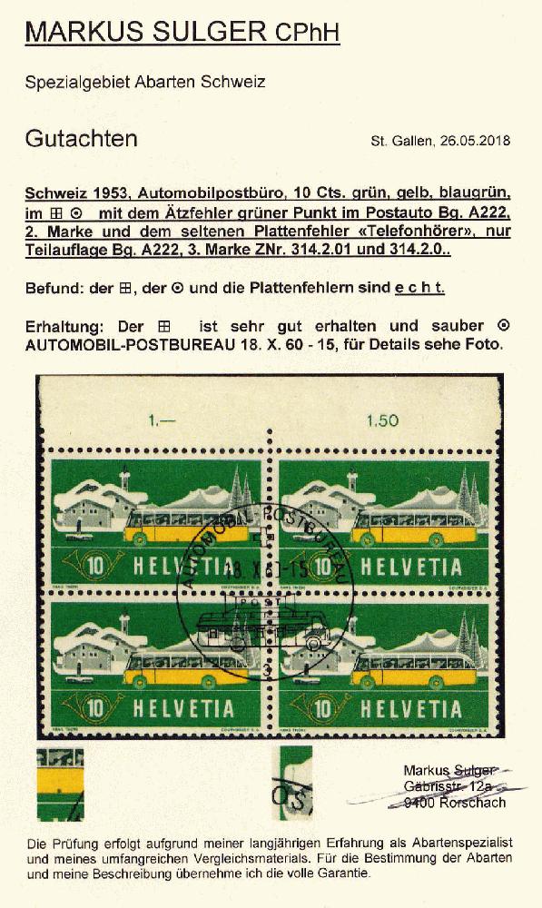 | Zusatzinformationen und Suchstichworte: | Leandra Honegger Briefmarken 4. November 2022 Los 1022 Schweiz Abarten (Frei- und Werbemarken) ABARTEN - FREI- & WERBEMARKEN 1953, 10Rp. Alpenpost im Winter, oberer rechte Marke bei Viererblock mit seltenem Plattenfehler "Telefonhörer", sowie kl. Ätzfehler "grüner Punkt im Postauto" bei oberer linker Marke, ZT-Stempel AUTOMOBIL-POSTBUREAU 18.X.60. Gutachten Sulger Ausruf 200,00 CHF |