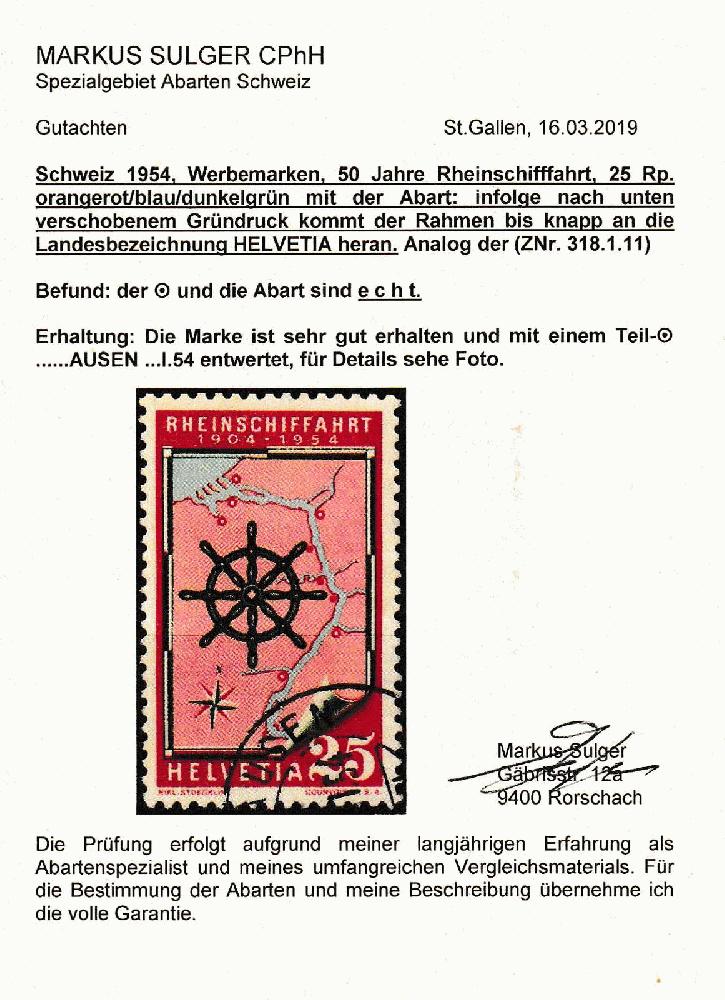| Zusatzinformationen und Suchstichworte: | Leandra Honegger Briefmarken 4. November 2022 Los 1026 Schweiz Abarten (Frei- und Werbemarken) ABARTEN - FREI- & WERBEMARKEN 1954, 25Rp. Rheinschiffahrt mit stark nach oben verschobenem Gründruck, Jahreszahlen durchbalkt, Eckstempel, Gutachten Sulger Ausruf 100,00 CHF |
