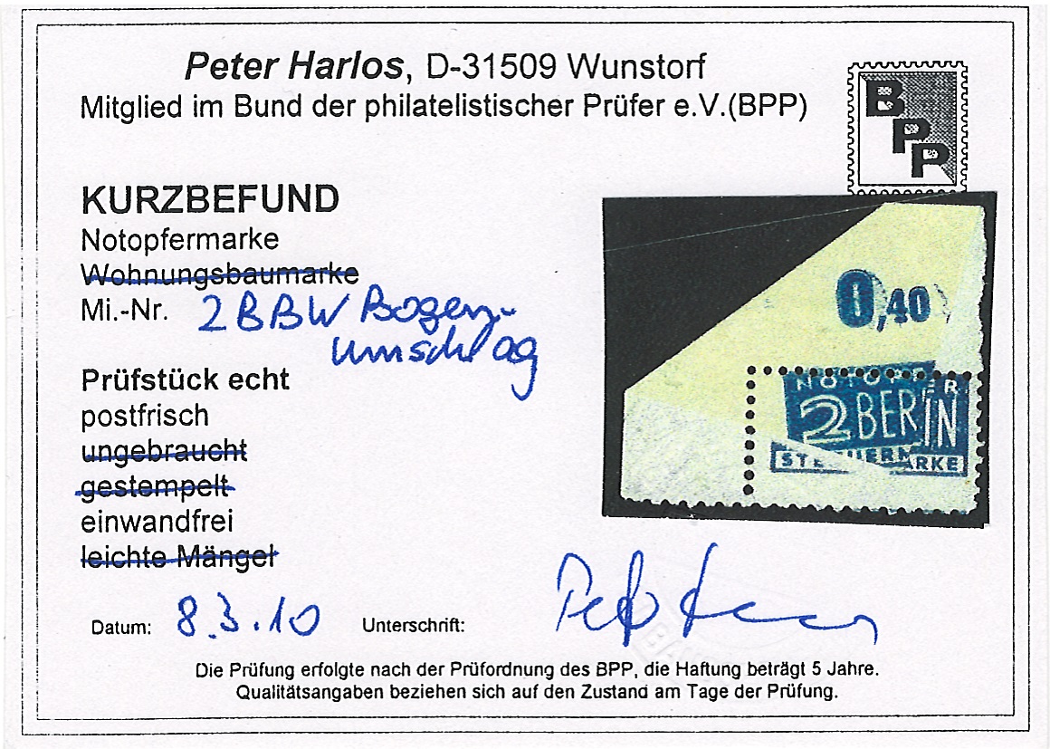 | Zusatzinformationen und Suchstichworte: | Notopfer Nr. 2 BBW Druck auf Gummiseite; umgeschlagene Bogenecke |