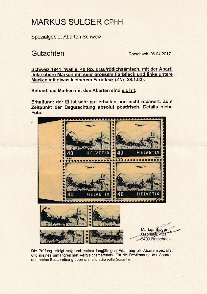 | Zusatzinformationen und Suchstichworte: | Leandra Honegger Briefmarken 4. November 2022 Los 1065 Schweiz Flugpostmarken ABARTEN - FLUGPOST 1941, Wallis, postfrischer Viererblock, l.u. Marke mit kleinerem, l.o. mit grösserem Farbfleck (Druckfarbenübersättigung). Gutachten Sulger Ausruf 300,00 CHF |
