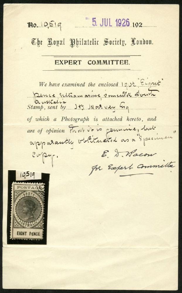 | Zusatzinformationen und Suchstichworte: | 249. Abacus Auktion 9. - 12. November 2022 Los 1372 Südaustralien Acht PENCE: 8d ultramarin mit acht PENCE 16½mm langen und EIGNT für acht ACSC S26c (SG 272a), Gefälligkeitsstempel mit Großteil Originalgummi Katalogwert $3000 (£3000). Ex Henry Harvey und Michael Blake: verkauft für $2355. RPSof L Attest (1926) signiert von "ED Bacon" Bundesländer " ...apparently ausgelöscht als ein Belegstück" Zuschlag 1.800,00 AUD |