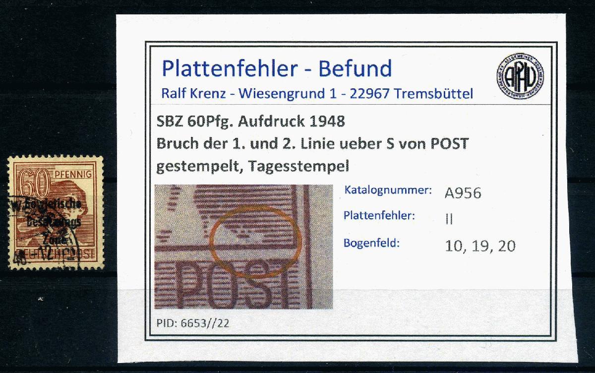 | Zusatzinformationen und Suchstichworte: | ebay.de SBZ 1948 PLATTENFEHLER Nr A195 PF II gestempelt (216549) Artikelnummer: 00000000216549 60Pfg. Arbeiter mit Maschinenaufdruck, sauber gestempelt Plattenfehler II: Bruch der Schraffurlinien ueber S von POST (100.-) Ausruf 12,50 EUR |