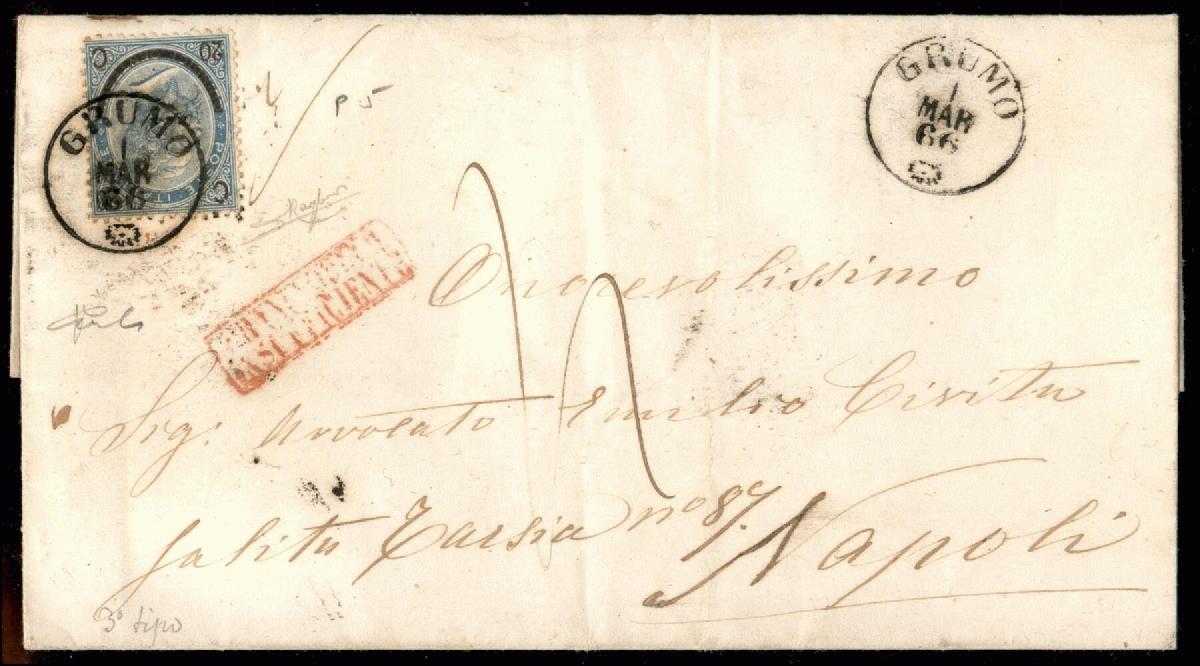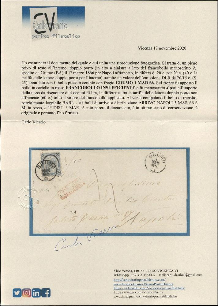 | Zusatzinformationen und Suchstichworte: | A.G. Srl Auction Gallery, Public Auction 5. Oktober 2022 Los 189 Italien Königreich - Vittorio Emanuele II Vittorio Emanuele II - Grumo (P.ti 5) - 20 cent su 15 (25 - Regno) su lettera per Napoli del 1.3.66 - tassata - cert. Vicario Ausruf 75,00 EUR |