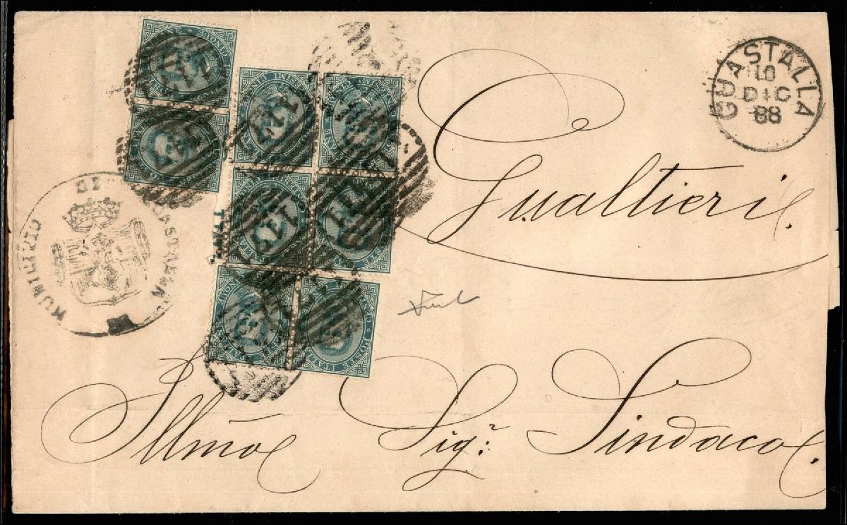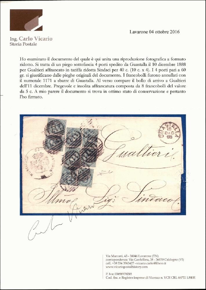 | Zusatzinformationen und Suchstichworte: | A.G. Srl Auction Gallery, Public Auction 5. Oktober 2022 Los 195 Italien Königreich - Umberto I Umberto I - 5 cent Umberto (37) - quartina + due coppie su piego da Guastalla a Gualtieri del 10.12.88 - cert. Vicario Ausruf 100,00 EUR |