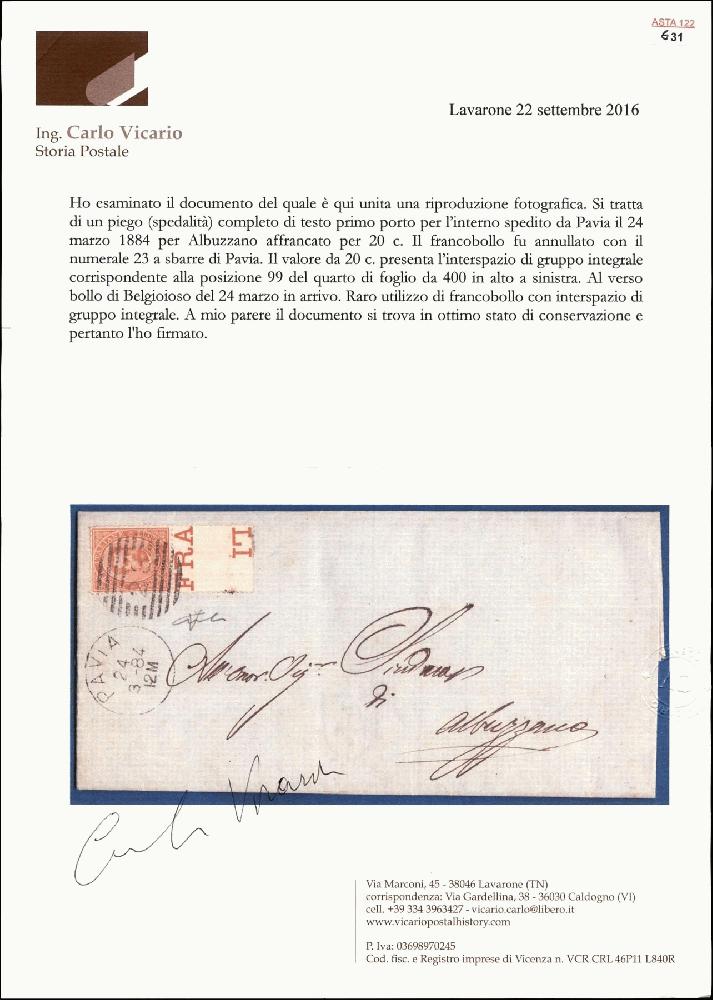 | Zusatzinformationen und Suchstichworte: | A.G. Srl Auction Gallery, Public Auction 5. Oktober 2022 Los 201 Italien Königreich - Umberto I Umberto I - 20 cent Umberto (39) con intero interspazio centrale in basso - piego da Pavia a Albuzzano del 24.3.84 - cert. Vicario Ausruf 140,00 EUR |