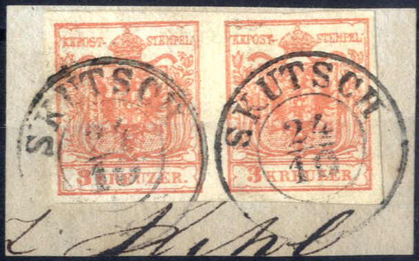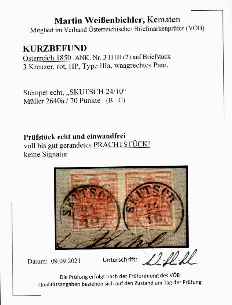 | Zusatzinformationen und Suchstichworte: | 75. Viennafil Live-Auktion 29. November - 2. Dezember 2022 Los 1543 Österreich Abstempelungen Böhmen "SKUTSCH / 24.10", RDs-f (Müller 70 Punkte), auf Briefstück mit Paar 3 Kr. rot Type IIIa HP, Befund Weißenbichler, ANK 3 IIIa HP Ausruf 50,00 EUR |