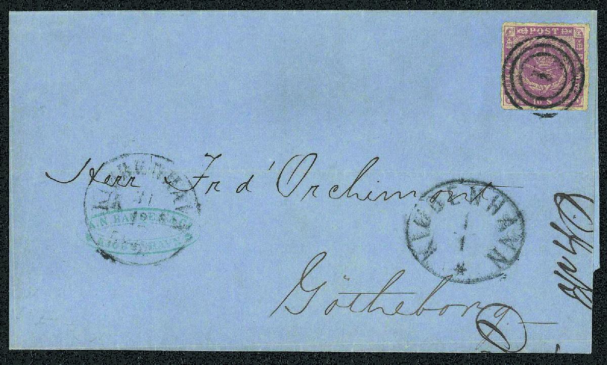 | Zusatzinformationen und Suchstichworte: | Gert Müller 116. Auktion 24. - 26. November 2022 Los 2052 Dänemark DIE EINZELFRANKATUR 16 SKILLING DURCHSTOCHEN: 16 Sk. rosalila, wundervoll farbfrisches, perfekt durchstochenes Luxusstück mit zentrischem, gestochen klarem, übergehendem Nummernstempel "1" auf bildschönem Brief mit beigesetztem K1 "KIOBENHAVN 31.12.(1864)" und ovalem Abgangsstempel der Briefpost "KIOBENHAVN 1.1.(1865)" nach Götheborg/Schweden. Einer der schönsten bekannten Briefe dieser überaus seltenen Einzelfrankatur. Ein Luxusbrief für höchste Ansprüche! Fotoattest Witschi/SBPV. Ausruf 2.500,00 EUR |