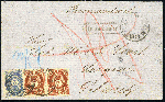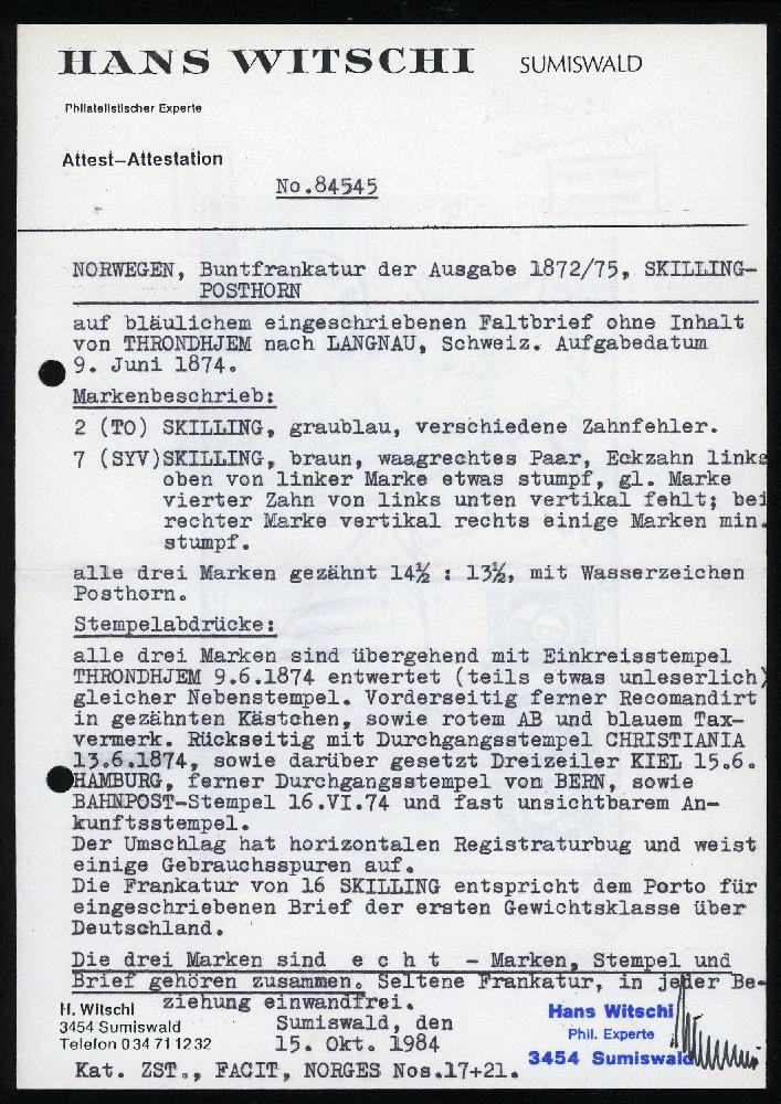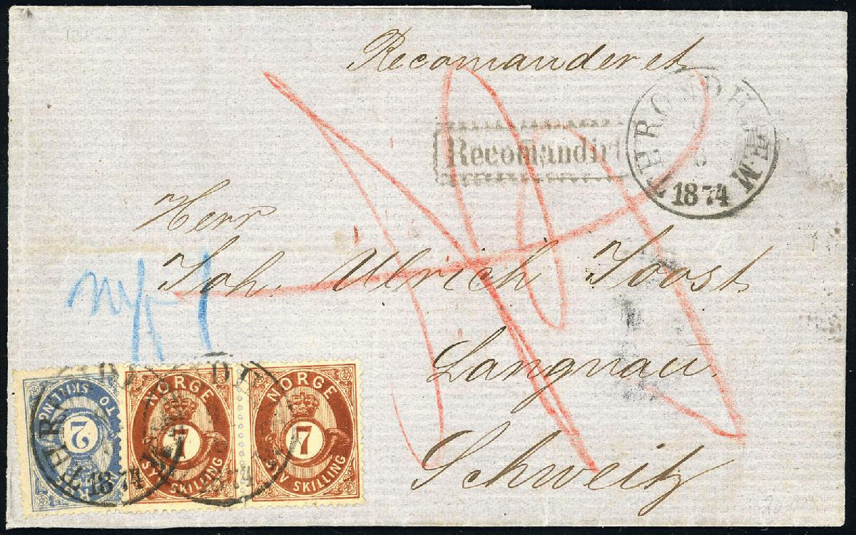 | Zusatzinformationen und Suchstichworte: | Skanfil Auktion - Herbst Auktion 2022 9. - 12. November 2022 Los 3879 Norwegen Skilling Posthorn 17 og 21. Enkeltmerke 2 skilling og vannrett par 7 skilling = 16 skilling stemplet "Throndhjem 9.6.1874" på meget pent brevomslag sendt rekommandert via Bern til Langnau, Sveits. Attest Witschi Ausruf 8.000,00 NOK |