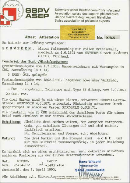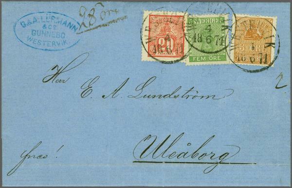 | Zusatzinformationen und Suchstichworte: | 291. - 297. Corinphila Auktion 28. November - 3. Dezember 2022 Los 3614 Schweden 1871 (June 4): Entire letter from Västervik to Uleåborg / Oulu, Finland, bearing 1858 Arms 5 öre yellow-green in mixed franking with Lying Lion 3 öre orange-brown and 20 öre red, three fine and fresh examples, tied by WESTERVIK cds in black. Attractive cover, paying correctly the 28 öre rate to Finland, cert. Witschi (1990) Facit 7c2+14Bd+16e = skr. 1'300. Ausruf 150,00 CHF |