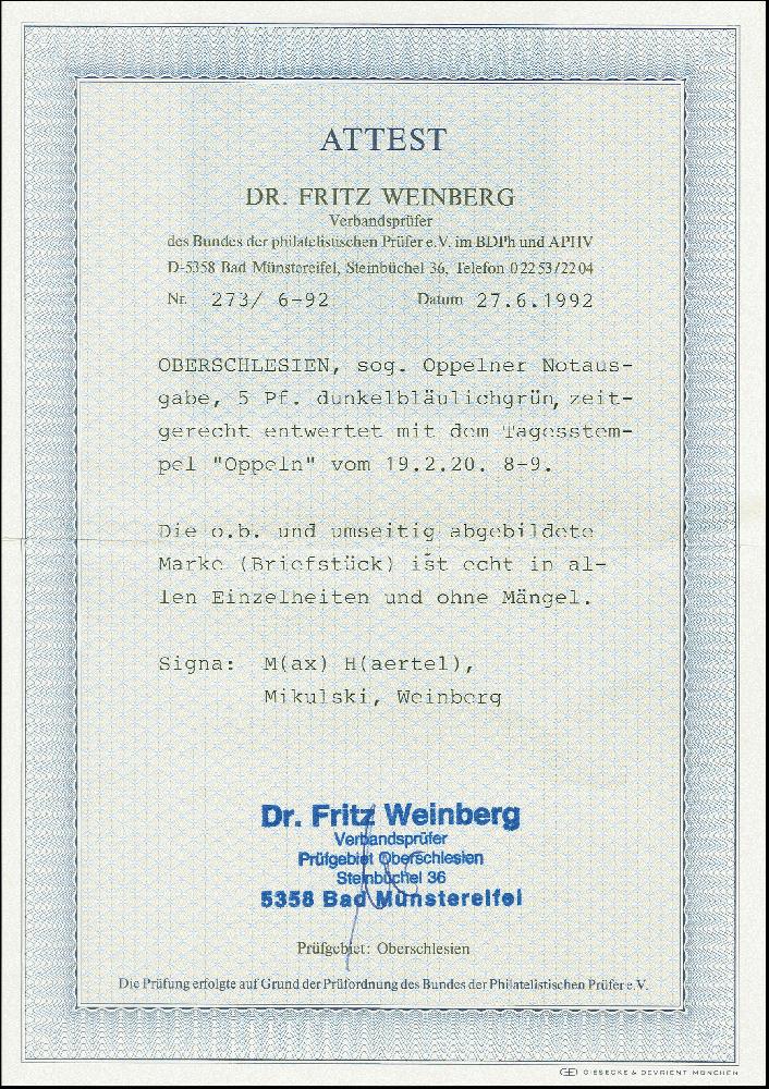 | Zusatzinformationen und Suchstichworte: | Heinrich Köhler 379. Auktion 19. - 24. September 2022 Los 3334 Ost-Oberschlesien Oppelner Notausgabe 5 Pfg. mit Stempel "OPPELN 19.2.20" auf Briefstück, tadellos, u.a. sign. Mikulski sowie Fotoattest Weinberg BPP (1992) Zuschlag 200,00 EUR |