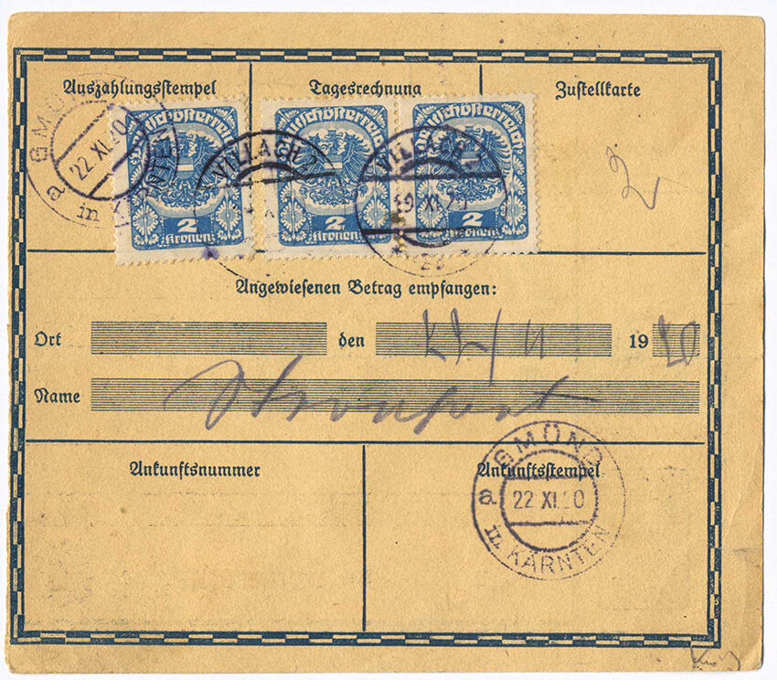 | Zusatzinformationen und Suchstichworte: | Merkurphila 51. Auktion 25. - 26. November 2022 Los 1294 Österreich 1. Republik Österreich, 1920, Wien, 23. Dez., Postanweisung mit Eindruck 50 h schmales Wappen, verwendet in der 3. Periode, gebraucht recht selten, Attest Kroiß Ausruf 200,00 EUR |