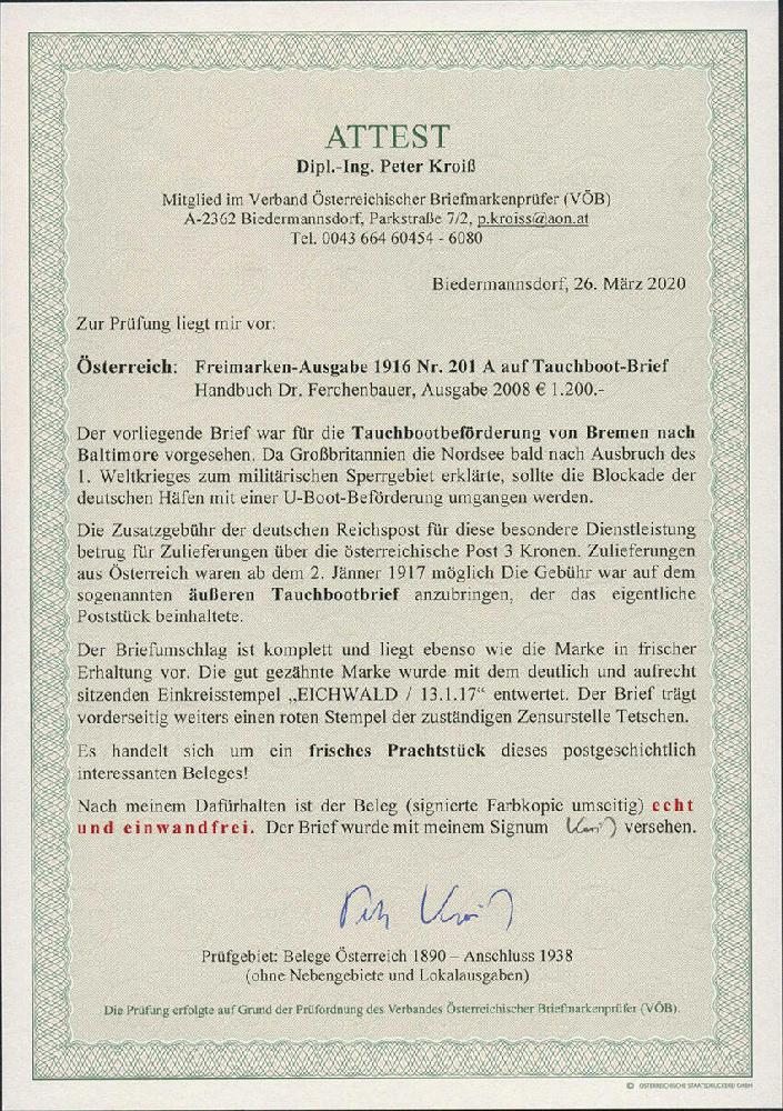 | Zusatzinformationen und Suchstichworte: | Merkurphila 51. Auktion 25. - 26. November 2022 Los 909 Österreich Ausgabe 1883 Österreich, Eichwald, 13.1.17 auf Tauchbootbrief mit 3 Kronen Ausgabe 1916, Attest Kroiß Ausruf 280,00 EUR |