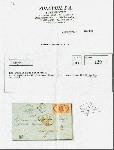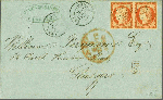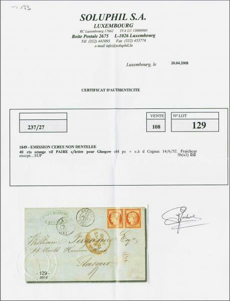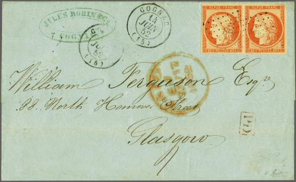 | Zusatzinformationen und Suchstichworte: | 291. - 297. Corinphila Auktion 28. November - 3. Dezember 2022 Los 3103 Frankreich 1849: Cover from Cognac to Glasgow, Scotland bearing a horizontal pair of Cérès 40 c. bright orange 'orange vif', a fine and fresh multiple with fair to large margins in a vibrant shade, lightly tied by Petits Chiffres '862' lozenge. Type 15 COGNAC despatch cds (June 14, 1852), framed PD and London "PAID 17 JU 1852" transit cds, these in red alongside. Reverse with PARIS transit cds and GLASGOW octagonal datestamp (June 18) in red. A most attractive cover, the franking paying correctly the single letter rate to the UK. Cert. Goebel (2008) Maury 5b = € 2'250. Ausruf 500,00 CHF |