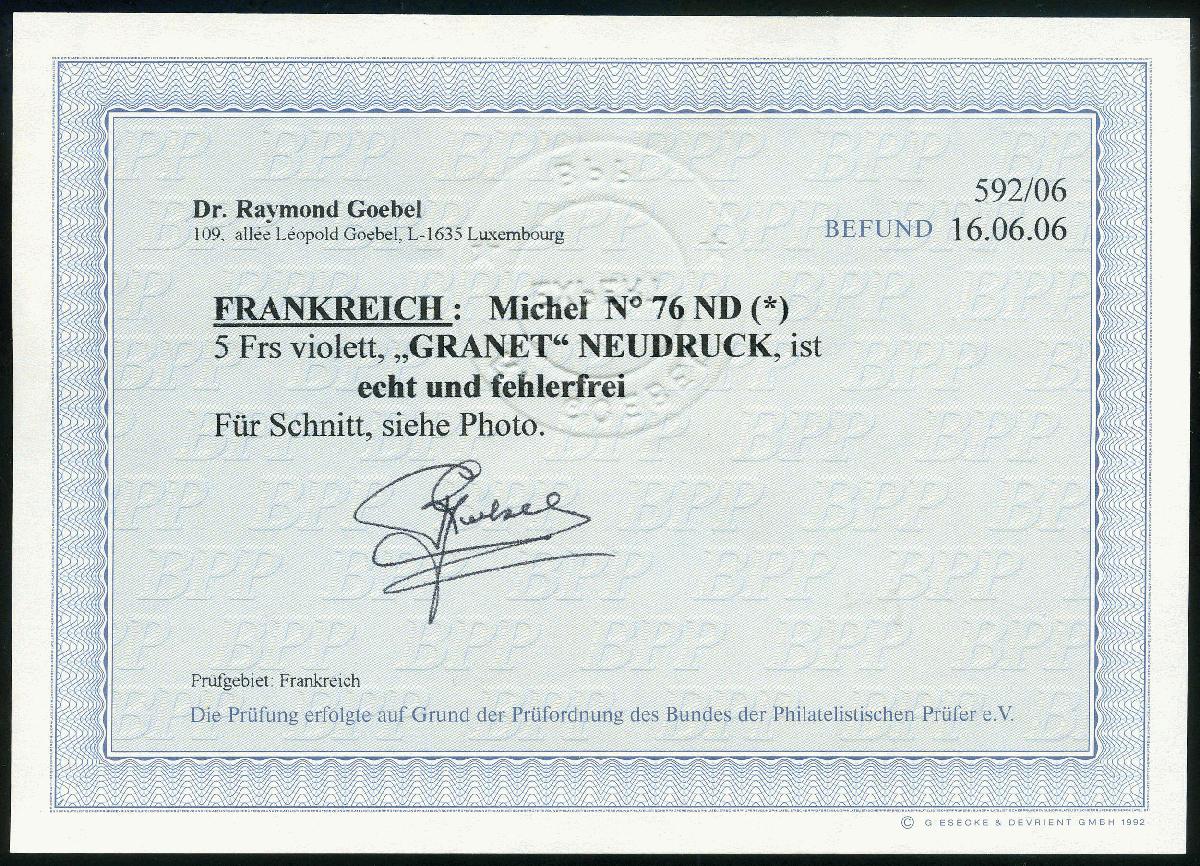 | Zusatzinformationen und Suchstichworte: | Skanfil Auktion - Herbst Auktion 2022 9. - 12. November 2022 Los 2408 Frankreich 76 ND. 5 Fr. violett - reprint, imperfed, very fine. Cert. Goebel. (€ 2000) Ausruf 2.000,00 NOK |