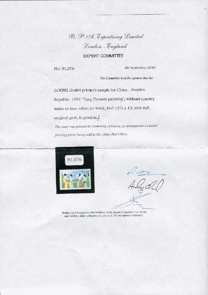| Zusatzinformationen und Suchstichworte: | 31. Schlegel Auktionshaus Auktion 14. - 18. November 2022 Los 6852 China VR "1997, Malerei der Tang Dynastie ohne Landesname und Wertangabe, gezähnte Maschinenprobe auf gummiertem Papier der Goebel GmbH, Darmstadt, angefertigt um die Arbeitsweise einer entsprechende Maschine der chinesische Post zu demonstrieren, Kopie eines Bogenteils mit Druckdatum "18.08.1997" anbei, Fotoattest BPA 09/2019" Ausruf 60,00 EUR |
