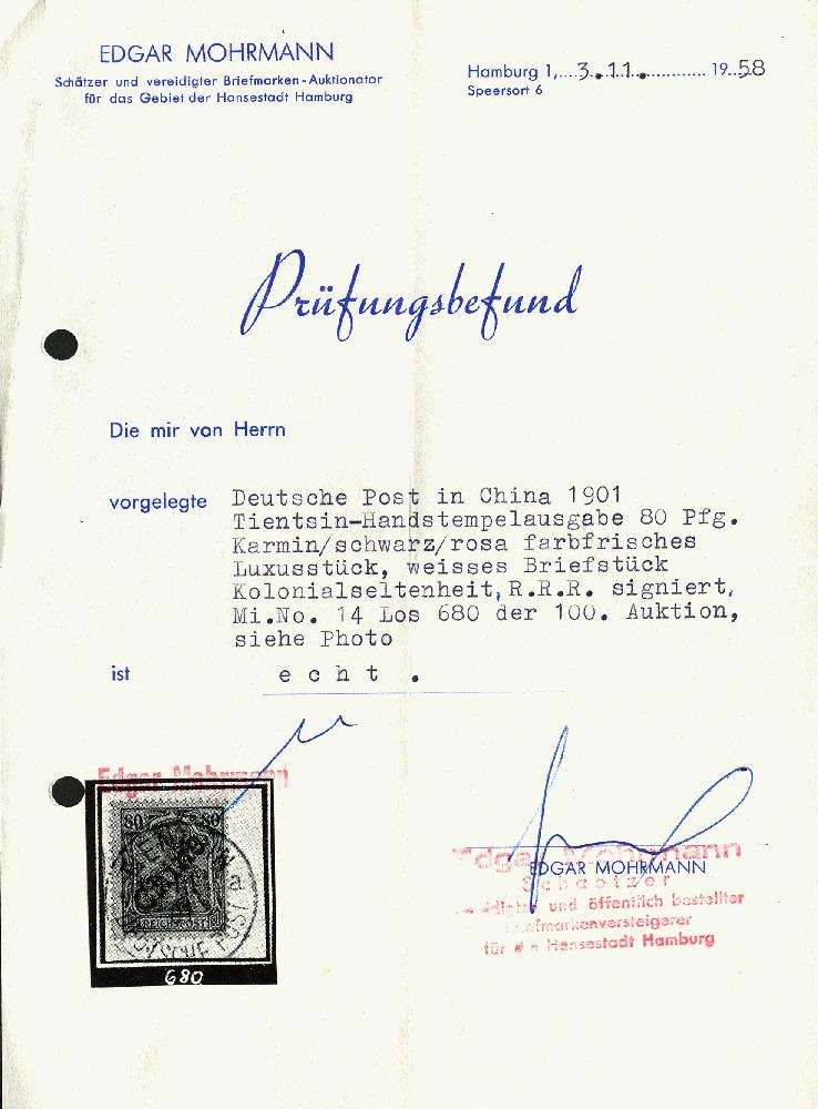 | Zusatzinformationen und Suchstichworte: | Lugdunum 123. Auktion 5. Dezember 2022 Los 647 Deutsche Auslandspost China CHINA : 80pf (n°14) canc. TIENTSIN on piece. Certificates MOHRMANN (1958) + JÄSCHKE-LANTELME (2021). superb Ausruf 2.000,00 EUR |