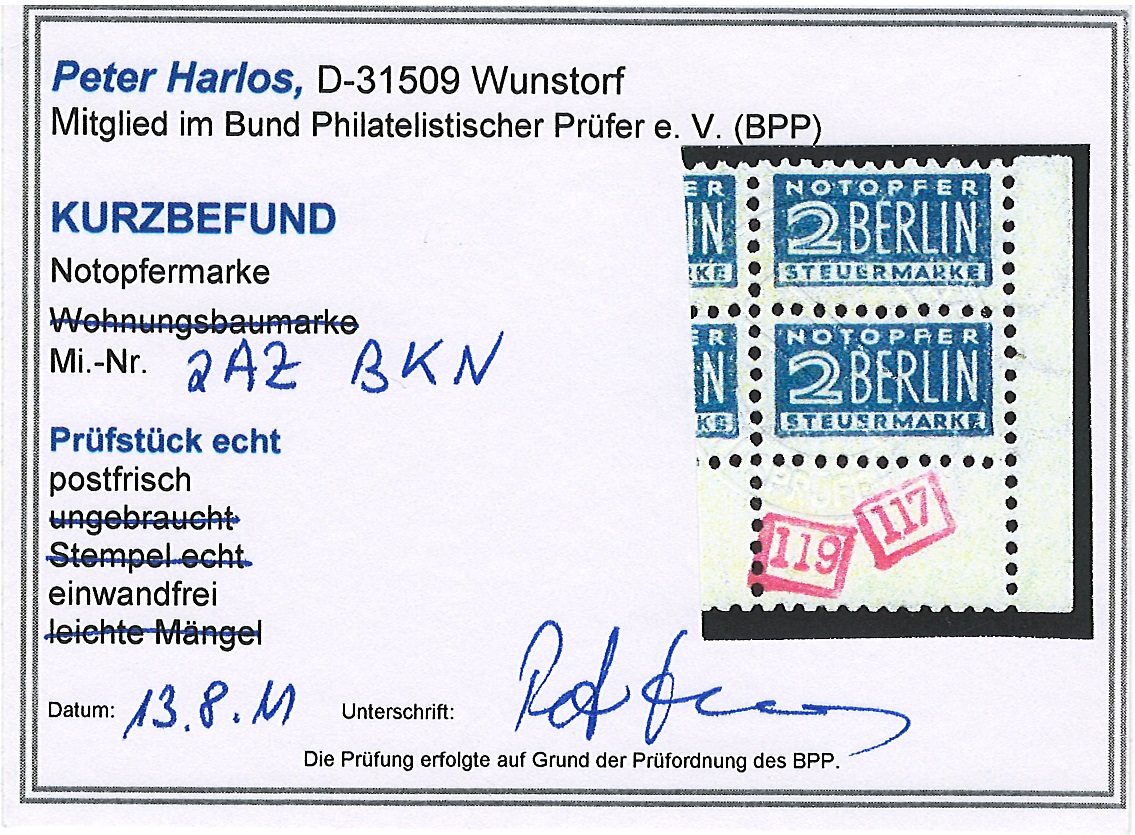 | Zusatzinformationen und Suchstichworte: | Notopfer Nr. 2 AZ mit Bogenkontrollnummern 119 und 117 |
