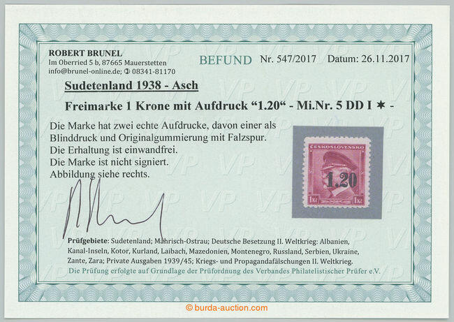 | Zusatzinformationen und Suchstichworte: | Burda 70. Auktion 19. November 2022 Los 1564 Sudetenland 1938 ASCH/Mi. 5 Deutsch Dienst post I, Masaryk 1,20/1Kc, schwarz Aufdruck, Briefmarke. Mit DVOJITYM Überdruck, von diesem 1x Prägedruck (albino) ; gefalzt, Attest Brunel, c. v. 500EUR, seltene Verwendung, gesucht speciality Ausruf 271,00 EUR |