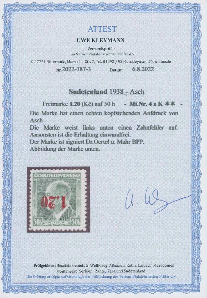 | Zusatzinformationen und Suchstichworte: | Ulrich Felzmann 176. Auktion 15. - 19. November 2022 Los 5595 Sudetenland Asch 1.20 auf 50 H Benes mit kopfstehendem magentarotem Aufdruck, postfrisch (!) mit links unten Eckzahnfehler, darüber hinaus einwandfrei, sign. Dr. Oertel und Mahr BPP sowie Fotoattest Kleymann Ausruf 100,00 EUR |