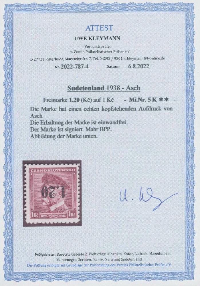 | Zusatzinformationen und Suchstichworte: | Ulrich Felzmann 176. Auktion 15. - 19. November 2022 Los 5596 Sudetenland Asch 1.20 auf 1 Kc Masaryk mit kopfstehendem Aufdruck in postfrischer (!) Top-Erhaltung, u.a. sign. Mahr BPP sowie Fotoattest Kleymann "... einwandfrei" Ausruf 100,00 EUR |