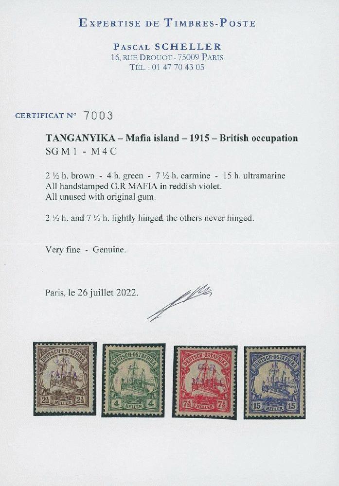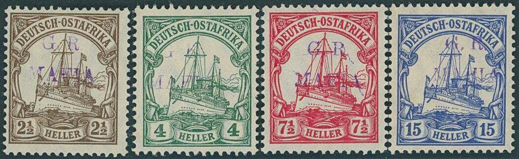 | Zusatzinformationen und Suchstichworte: | Ulrich Felzmann 176. Auktion 15. - 19. November 2022 Los 5429 Deutsche Kolonien Ostafrika G. R. MAFIA in rötlichviolett auf 2½, 4, 7½ und 15 H Kaiseryacht, alle tadellos ungebraucht mit vollem Originalgummi, 4 und 15 H sogar postfrisch! U.a. sign. Hoffmann Giesecke sowie Fotoattest Scheller (S.G. M1-4C) Ausruf 400,00 EUR |