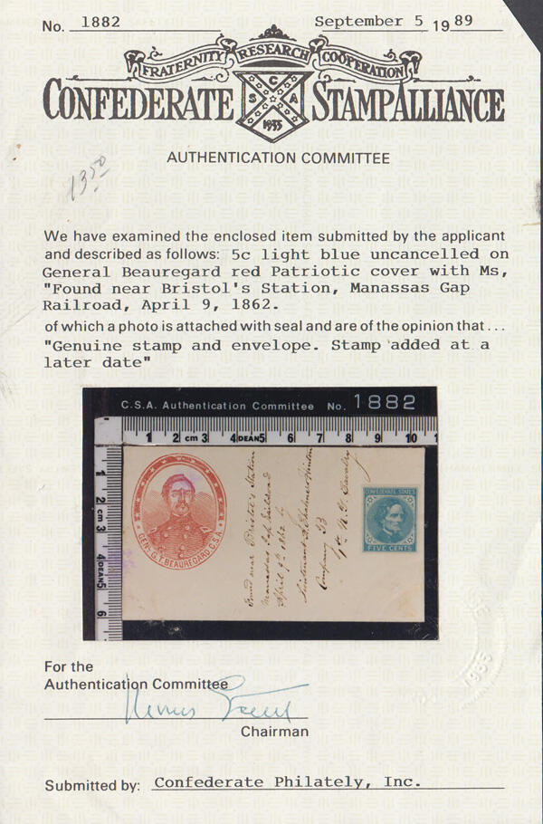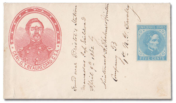 | Zusatzinformationen und Suchstichworte: | Kelleher 777. Auktion 15. - 17. November 2022 Los 115 Konföderierte Staaten Porträt von General Beauregard (C. S. A. Katalog MS-1), in rot auf ein kleiner Damenbrief, ungebraucht mit ein handschriftlicher Leitvermerk, "vorgefunden nahe Bristoes Station, Manassas Aussparung Eisenbahn, April 9. 1862 bei Oberleutnant A. Chalmers Hinton, Co. B, erste N. Y. Kavallerie" mit ein 5¢ Londoner Druck (6) beigefügten später; außergewöhnlich frisch, sehr fein und ungewöhnlich, ex-Gatsby, mit ein 1989 C. S. A. Attest. Hinton war ein 2. ltnl damals und wollte am Ende Erlang die Ranges von Hauptmann |