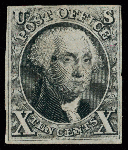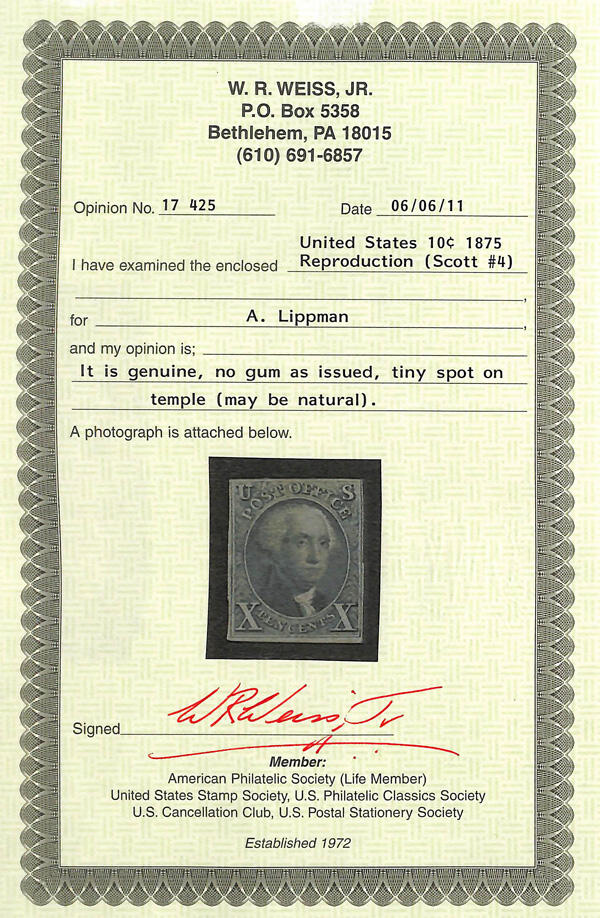 | Zusatzinformationen und Suchstichworte: | Kelleher 777. Auktion 15. - 17. November 2022 Los 251 USA 1847 Ausgabe 1847 (1875 Reproduktion), 10¢ schwarz (Scott 4), ohne Gummi, wie verausgabt, scharfer Druck, solider Farbe, drei Seitenrand, in oben; kleines Tintenfleck auf Tempel, ansonsten fein, ex Lippman, mit 2011 Weiss Attest. Scott $1,250 Ausruf 150,00 USD |