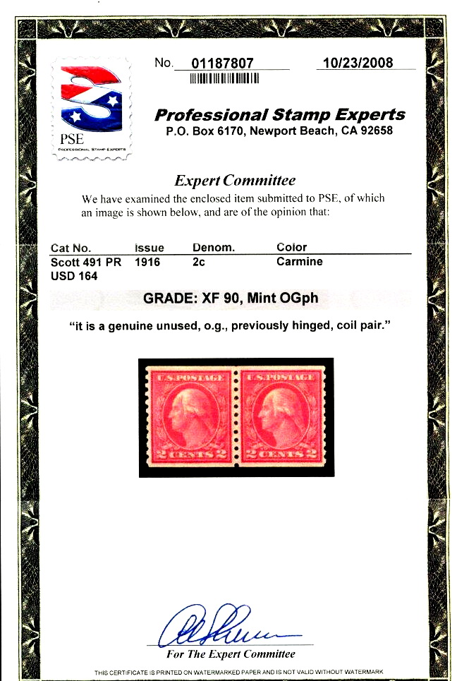 | Zusatzinformationen und Suchstichworte: | Cherrystone - Rare Stamps and Covers of the World 15. - 16. November 2022 Los 240 USA 1909-1921 Ausgaben 1916 2c carmine, horizontal pair, very lightly hinged, well centered with nice margins, beautiful color, seldom seen in such premium condition, A major United States Coil rarity, with 2008 PSE certificate, and 1973 and 2021 PFCs, the latter PFC and PSE cert. graded "XF 90" (SMQ $11,000) Ausruf 10.000,00 USD |