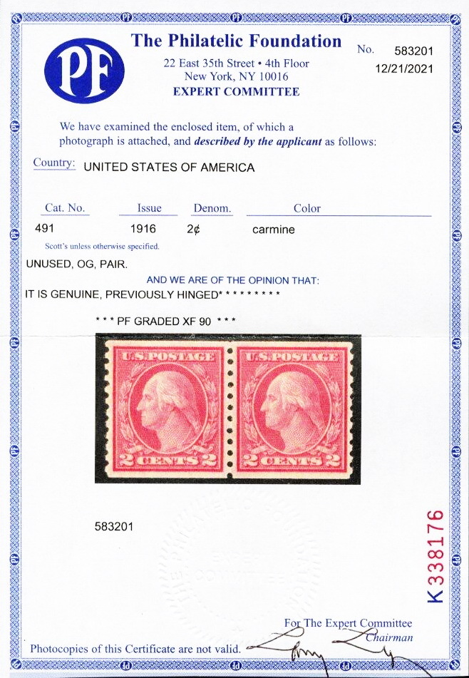 | Zusatzinformationen und Suchstichworte: | Cherrystone - Rare Stamps and Covers of the World 15. - 16. November 2022 Los 240 USA 1909-1921 Ausgaben 1916 2c carmine, horizontal pair, very lightly hinged, well centered with nice margins, beautiful color, seldom seen in such premium condition, A major United States Coil rarity, with 2008 PSE certificate, and 1973 and 2021 PFCs, the latter PFC and PSE cert. graded "XF 90" (SMQ $11,000) Ausruf 10.000,00 USD |