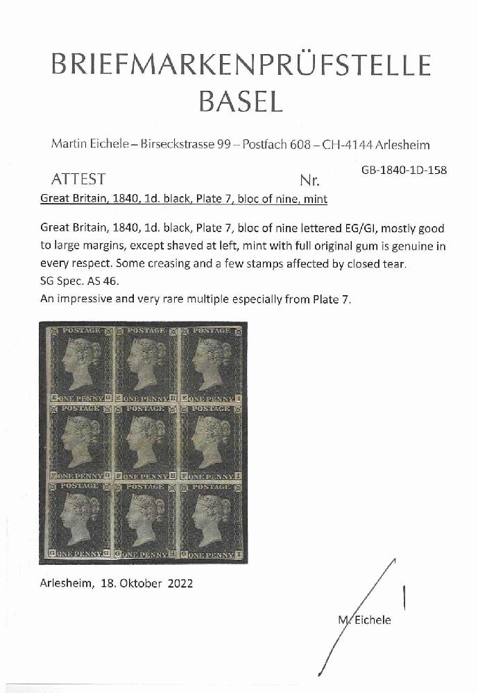 | Zusatzinformationen und Suchstichworte: | 41. Jean-Paul Bach Auktion 17. - 20. November 2022 Los 130 Grossbritannien 1840 1d schwarz 1840, 1 P. schwarz, Platte VII, EG-GI, farbfrischer 9er-Block mit Originalgummi, an 3 Seiten angeschnitten, eine spektakuläre Einheit, trotz der Schnittmängel, sehr dekorativ. Atteste Scheller und BP. Kat. ca. 350`000 Euro. Ausruf 60.000,00 CHF |
