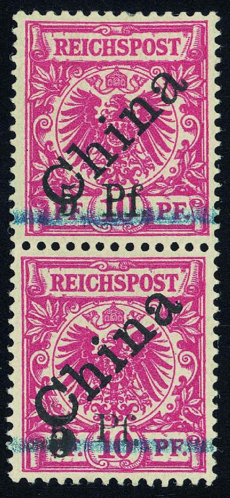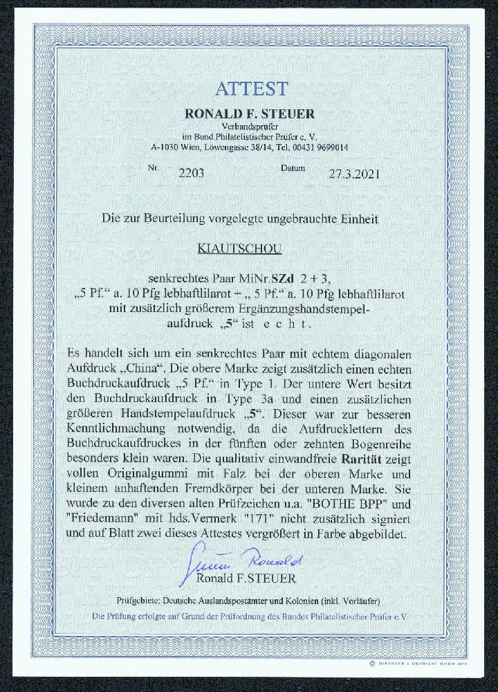 | Zusatzinformationen und Suchstichworte: | Gert Müller 116. Auktion 24. - 26. November 2022 Los 2503 Deutsche Kolonien Kiautschou SPEKTAKULÄRER ZUSAMMENDRUCK TSINGTAU-PROVISORIEN MIT UNTERTYPE: 5 Pf. auf 10 Pfg. lebhaftlilarot und 5 Pfg. auf 10 Pfg. lebhaftlilarot mit zusätzlichem Ergänzungshandstempel 5, der sensationelle Zusammendruck, diagonaler Aufdruck, als senkrechtes Paar zusammenhängend, farbfrisch und sehr gut gezähnt bzw. zentriert, tadellos ungebraucht mit Originalgummierung. Der obere Wert ist in Type I (Mi.Nr. 2) und der untere Wert in Type 3a (Mi.Nr. 3). Bereits eine normale Mi.Nr. 3 ist als Aufdruck-Untertype nahezu unauffindbar. In dieser Form als Zusammendruck handelt es sich um eine der spektakulärsten Raritäten der Deutschen Kolonien und höchstwahrscheinlich um ein Unikat! Geprüft Friedemann, Bothe BPP und aktuelles Fotoattest Steuer BPP. Ausruf 75.000,00 EUR |