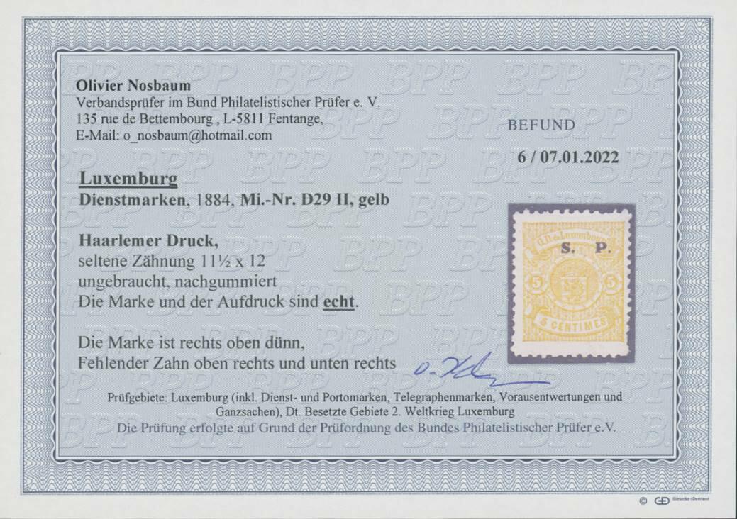| Zusatzinformationen und Suchstichworte: | Ulrich Felzmann 34. e@uction 5. - 9. September 2022 Los 12520 Luxemburg 5 C gelb mit breiter Aufdrucktype in seltener Zähnungsvariante 11½:12, ungebraucht mit Neugummi und fehlerhaft, Fotobefund Nosbaum BPP "seltene Zähnung" Zuschlag 100,00 EUR |