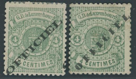 | Zusatzinformationen und Suchstichworte: | Ulrich Felzmann 34. e@uction 5. - 9. September 2022 Los 12519 Luxemburg 4 C blaugrün mit beiden Aufdrucktypen, je ungebraucht mit Originalgummi, ausgabentypisch zentriert und gezähnt, Type II zwei kurze Zähne, Type I einwandfrei, je Foto-Kurzbefund Nosbaum BPP, Katalogwert ohne Gummi bereits 320,- Ausruf 60,00 EUR |