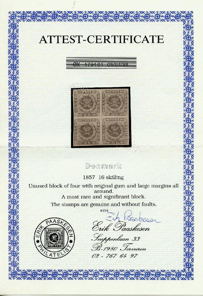 | Zusatzinformationen und Suchstichworte: | Postiljonen 237. Int. Briefmarken Auktion 29. September - 01. Oktober 2022 Los 590 Dänemark Skilling Ausgabe Block of Four 16 Skilling A fantastic block in violet grey shade with wide margins all around. Extremely fresh with no trace of hinges. Certs Grønlund, Paaskesen & Møller. EXCELLENT EXHIBITION ITEM, Provenance: Knud-Erik Reddersen Zuschlag 4.000,00 EUR |