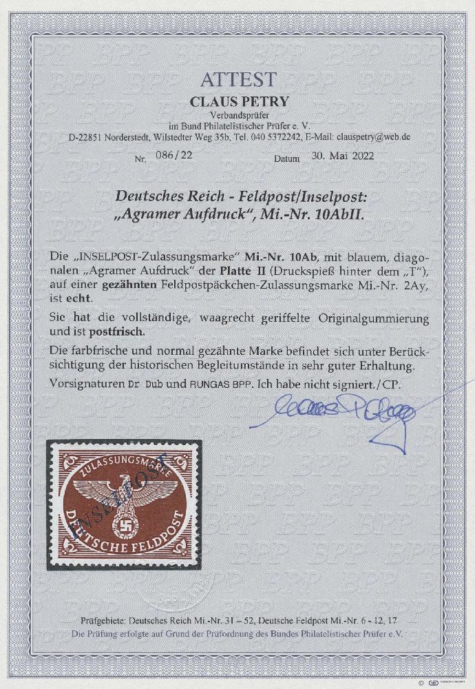 | Zusatzinformationen und Suchstichworte: | Auction Galleries Hamburg 25. Auktion 2. - 3. September 2022 Los 1353 Deutsche Besetzung II. WK, Feldpostmarken 1944, Zulassungsmarke gezähnt mit blauem diagonalem Agramer Aufdruck in postfrischer Erhaltung mit vollständigem waagerecht geriffeltem Originalgummi geprüft Dr. Dub und Rungas BPP. Laut neuestem Fotoattest Petry BPP ist die Marke echt, postfrisch, farbfrisch, normal gezähnt und in sehr guter Erhaltung. Michel 700,- Euro Zuschlag 180,00 EUR |