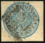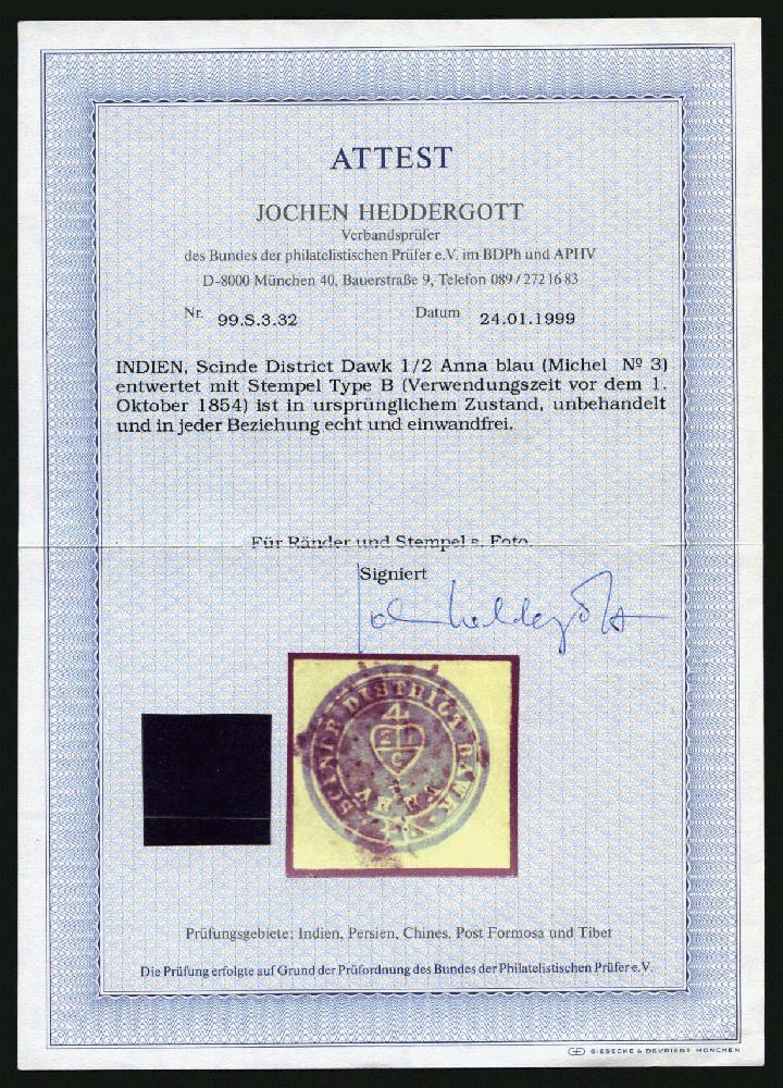 | Zusatzinformationen und Suchstichworte: | David Feldman S.A. - Great Britain and British Empire 5. - 9. Dezember 2022 Los 61211 Indien 1852 Scinde Dawk 1/2a blue, fine to large margins, cancelled by lozenge of dots, good embossed impression, a rare stamp especially in such fine condition, signed and cert. Heddergott (1999) (S.G. £11'000) Ausruf 3.000,00 GBP |