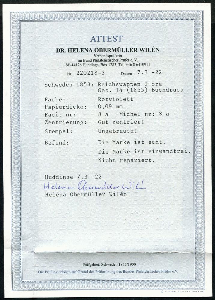| Zusatzinformationen und Suchstichworte: | 109. Briefmarken Lenz Auktion 31. Oktober - 3. November 2022 Los 1516 Schweden Wappen Ausgabe 1858, 9 Öre rotviolett, ungebraucht, neues Attest Obermüller Wilen BPP 3/22 "echt, die Marke ist einwandfrei"! Zuschlag 100,00 EUR |
