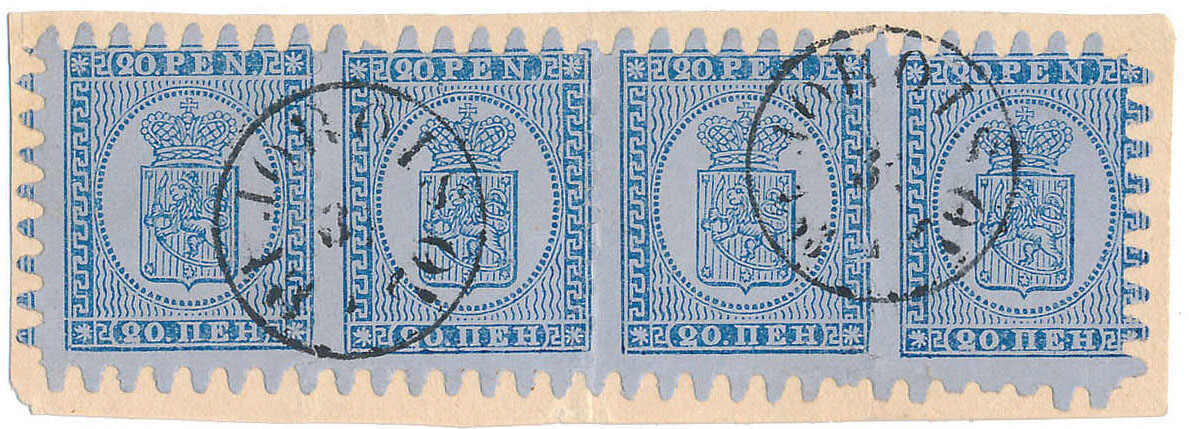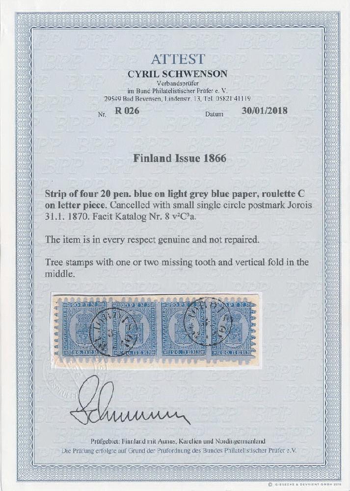 | Zusatzinformationen und Suchstichworte: | Postiljonen 237. Int. Briefmarken Auktion 29. September - 01. Oktober 2022 Los 466 Finnland 1860 Wappen durchstochen Extremely beautiful piece with a strip of four of 20 penni in roulette III, excellent "JOROIS 31.1 1870". Just a few missing perfs and a vertical fold in between the middle perf. raw. Ex. Toivakka. Certs Oesch & Schwenson. Zuschlag 340,00 EUR |