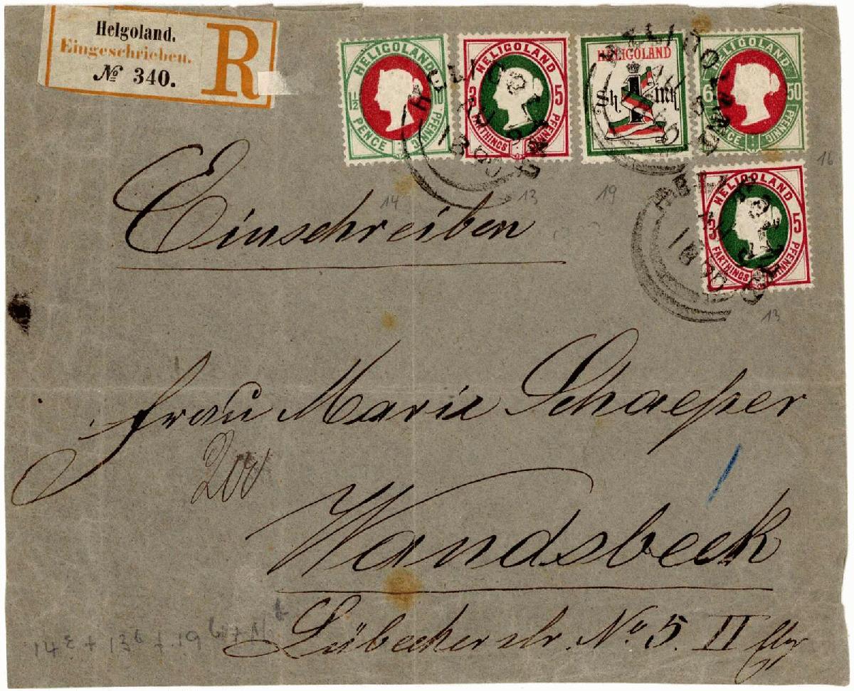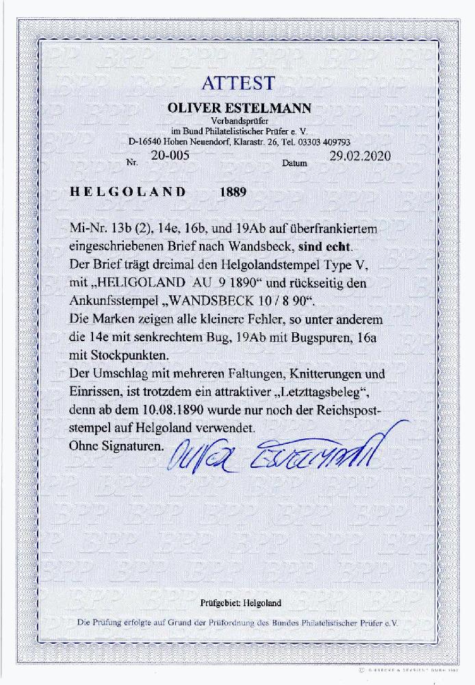 | Zusatzinformationen und Suchstichworte: | 230. Karl Pfankuch & Co Auktion 7. - 8. Dezember 2022 Los 328 Altdeutschland Helgoland Nr. 13 b (2), 14 e, 16 b und 19 Ab auf überfrankiertem R-Brief nach Wndsbeck, sauber mit Rundstpl. Type V vom 9. August 1890 (Letztag) und rückseitigem Ankunftsstpl., Marken mit kl. Fehlern, u.a. Nr.14 e senkr. Bug, Umschlag div. Mängel, Fotoattest Estelmann, ein attraktiver Letztagsbeleg, ab 10.8.1890 wurde nur noch der Reichspoststpl. auf Helgoland verwendet. Ausruf 550,00 EUR |