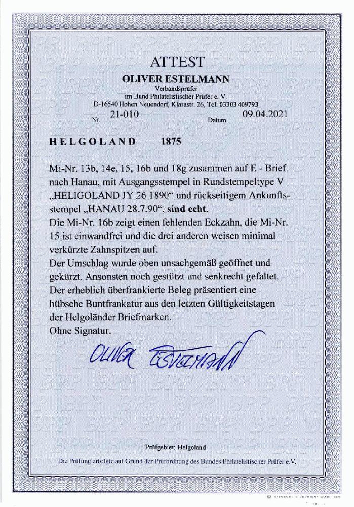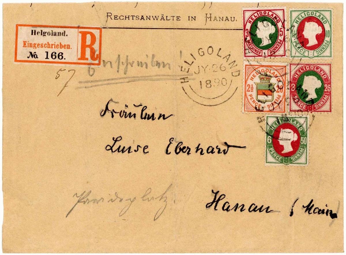 | Zusatzinformationen und Suchstichworte: | 230. Karl Pfankuch & Co Auktion 7. - 8. Dezember 2022 Los 329 Altdeutschland Helgoland Nr. 13 b, 14 e, 15, 16 b und 18 g zusammen auf dekoartivem überfrankiertem R-Brief mit Rundstpl. "HELGOLAND JY 26 1890" (Type V) nach Hanau, rücks. Ankunftsstpl., 16 b fehlender Eckzahn, Nr. 15 einwandfrei, die drei anderen Mraken minimal verkürzte Zahnspitzen, Kuvert div. Beeinträchtigungen, Fotoattest Estelmann, eine schöne Buntfrankatur aus den letzten Gültigkeitstagen der Helgoländer Briefmarken. Ausruf 400,00 EUR |