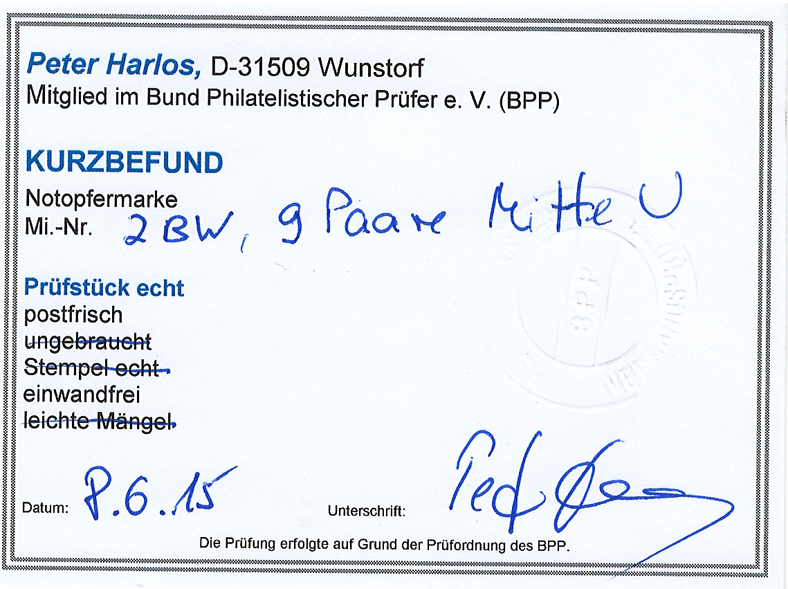 | Zusatzinformationen und Suchstichworte: | Notopfer Nr. 2 BW - 9 Paare jeweils ohne Linienzähnung |