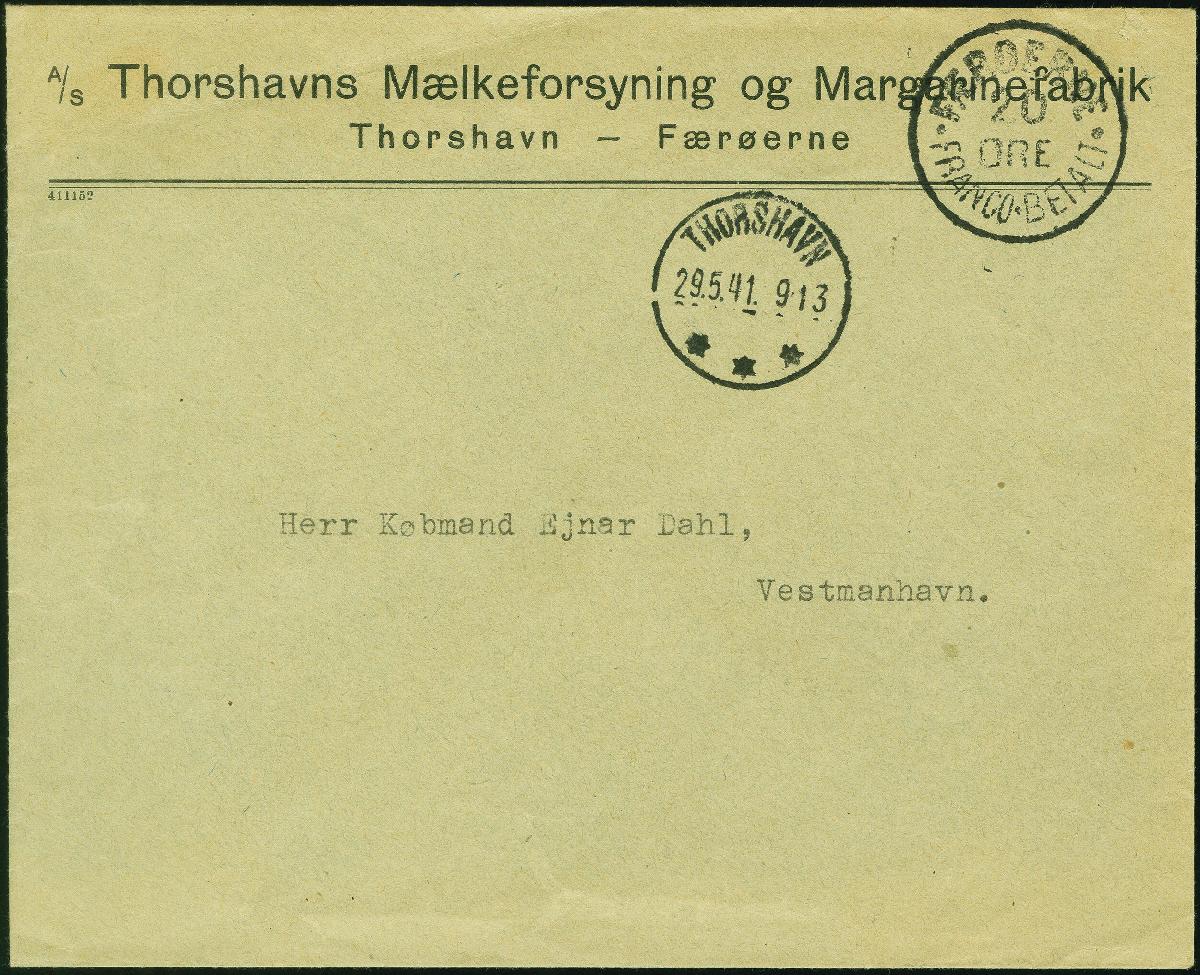 | Zusatzinformationen und Suchstichworte: | Heinrich Köhler 379. Auktion 19. - 24. September 2022 Los 1061 Färoer "FRANCO BETALT 20 ØRE" with adjacent "THORSHAVN 29.5.41" on commercial envelope to Vestmanhavn; very fine. Certificate Wovern (1991) Zuschlag 160,00 EUR |