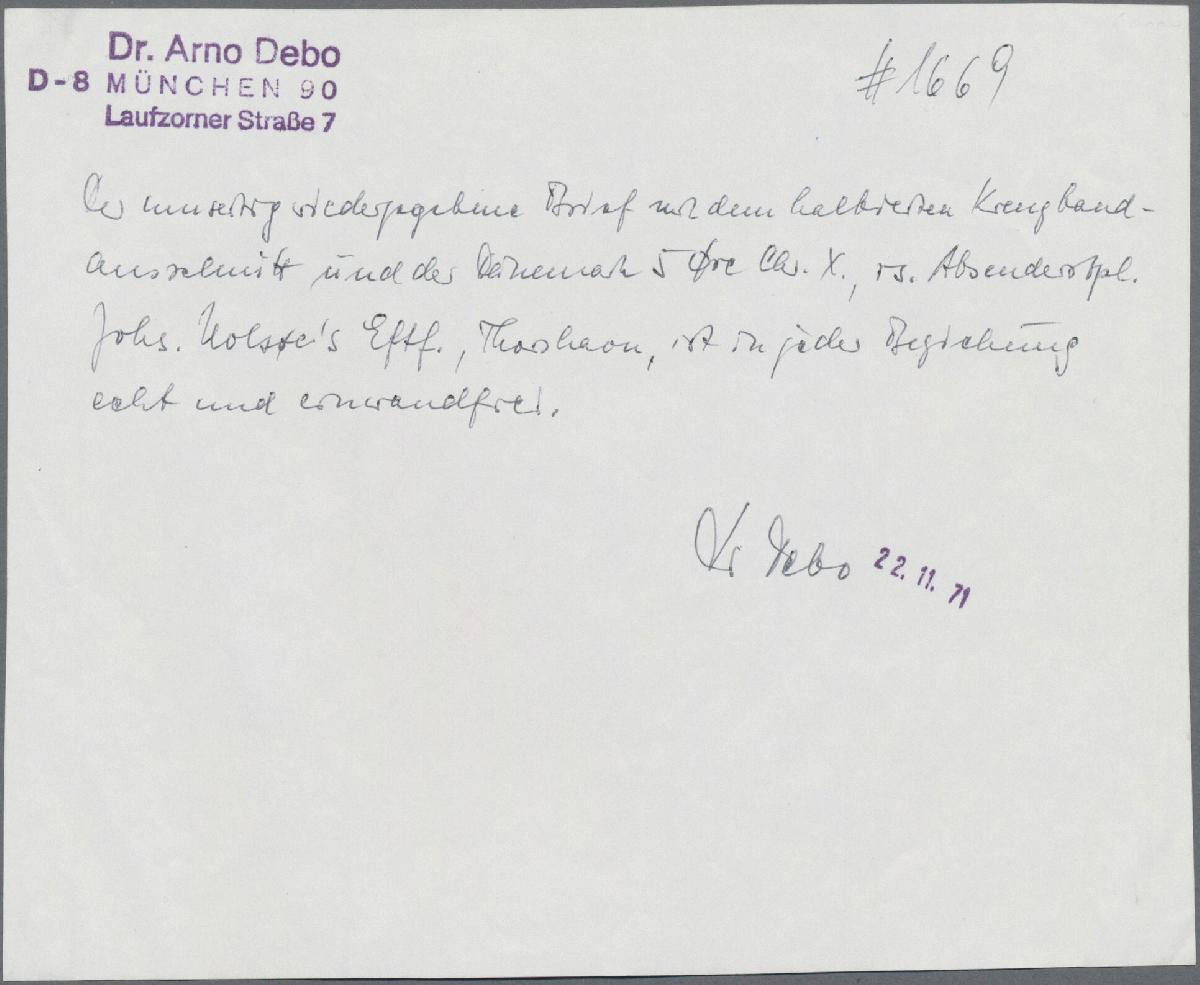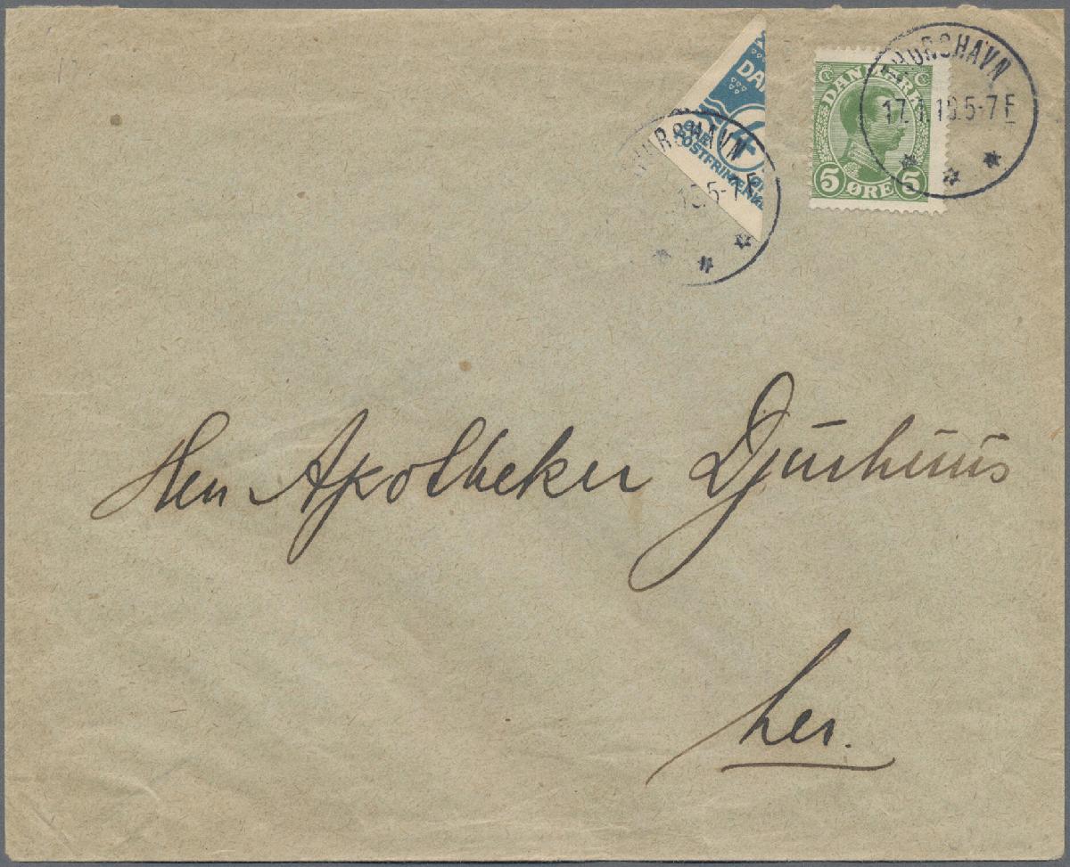 | Zusatzinformationen und Suchstichworte: | Christoph Gärtner 54. Auktion 18. - 19. Oktober 2022 Los 3736 D Färoer 1919, 5 O green "Christian X" and bisected stationery cutout of the 4 O, very wide margins, each with cds "THORSHAVN. 17.1.19" on local cover. Certificate Debo: "genuine and flawless". ÷ 1919, 5 O grün "Christian X" und halbierter Streifbandausschnitt der 4 O (S 12), sehr breitrandig, jeweils mit K1 "THORSHAVN. 17.1.19" auf Lokalbrief. Fotobefund Debo: "echt und einwandfrei" Ausruf 550,00 EUR |